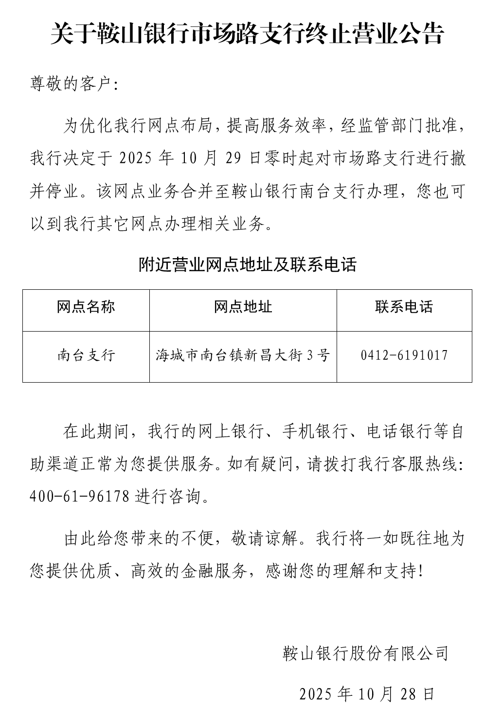 当前位置:首页 > 最新公告 >关于鞍山银行市场路支行终止营业公告